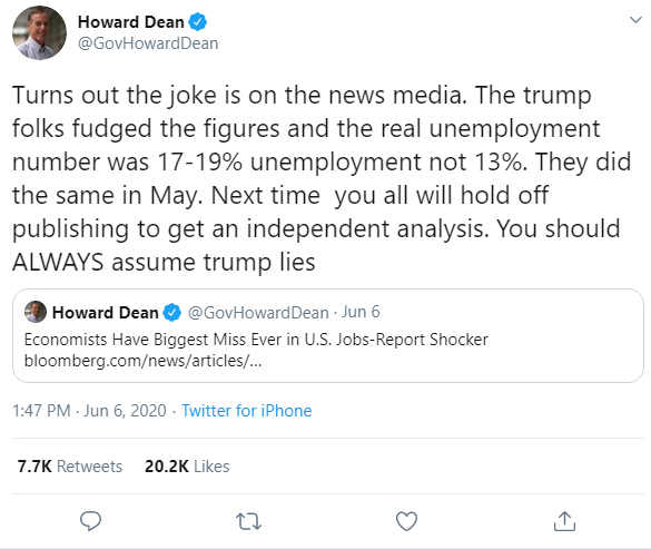 佛蒙特州前州長(zhǎng)霍華德·迪恩在推特上說(shuō):“特朗普的人竄改了數(shù)字,真實(shí)的失業(yè)率是17%-19%,而不是13%。他們?cè)?月也是這樣干的。”