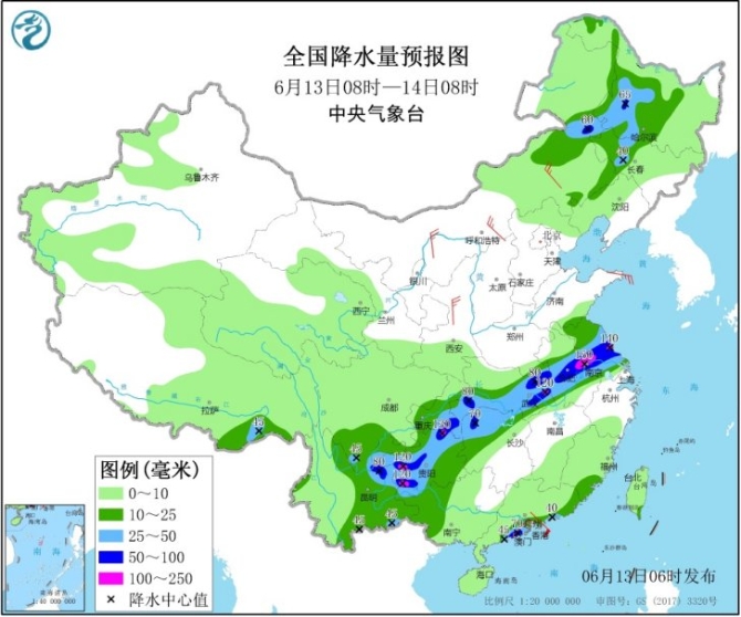受臺(tái)風(fēng)影響,6月13日,貴州至江淮一帶有強(qiáng)降雨天氣,江蘇中南部、安徽中部、湖北東部和南部、湖南西北部、重慶東南部、貴州中西部和東北部、云南東北部等地部分地區(qū)有暴雨、局地大暴雨;預(yù)計(jì)14—15日,江淮地區(qū)仍有持續(xù)較強(qiáng)降雨,蘇皖中南部、河南南部、湖北東部等地有大到暴雨、局地有大暴雨。