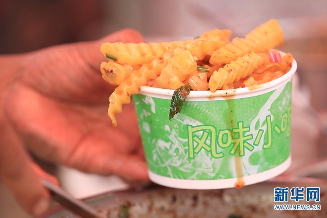 拌好佐料的炸洋芋(5月23日攝)。新華網(wǎng) 徐華陵/攝