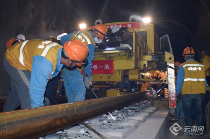當(dāng)天上午,在位于云南省大理市大理站西端,隨著現(xiàn)場指揮人員一聲號令,鋪軌牽引車開始緩緩向前移動,施工人員迅速在鐵軌兩端進(jìn)行測量、調(diào)整,確保軌道精準(zhǔn)落下。20分鐘后,兩條長500米、重60噸的長鋼軌平穩(wěn)落在道床上,全線鋪軌工作正式展開。