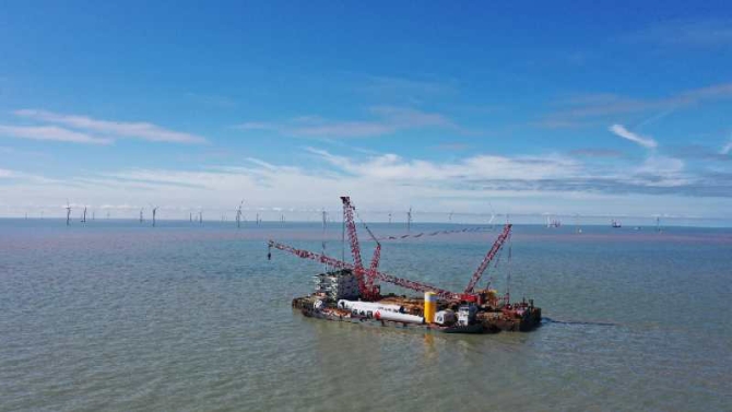 我國首個中外合資海上風電項目,東臺五期風電項目與已并網(wǎng)投產的東臺四期風電項目是國家能源集團國華投資公司與法國電力公司合作的新能源合資項目,位于江蘇東臺黃海海域,離岸直線距離約40千米,涉海面積約78平方千米。項目復工后,各項重點工作和施工有序推進。東臺四期項目是目前我國已投產發(fā)電離岸最遠、綜合施工難度最高的海上風電項目。6月10日,東臺五期竹根沙H1#風電項目首臺風機塔筒、輪轂、機艙等組件從碼頭發(fā)運,預計6月中旬完成吊裝。
