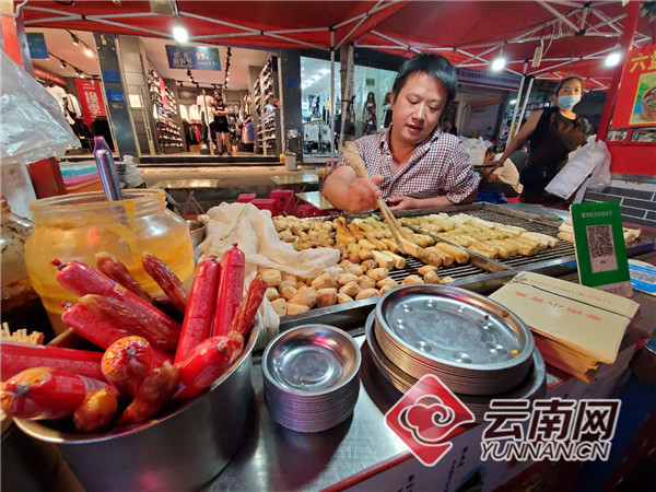 昆明雙橋夜市,老板正在準(zhǔn)備云南特色的燒烤——烤豆腐。張成 攝