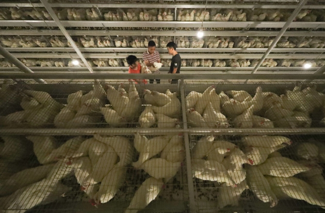 ↑6月11日,在玉屏縣麻音塘街道辦事處祥查村蛋雞養(yǎng)殖場(chǎng),洪余(中)與工人查看蛋雞的生長(zhǎng)情況。新華社發(fā)(胡攀學(xué) 攝)