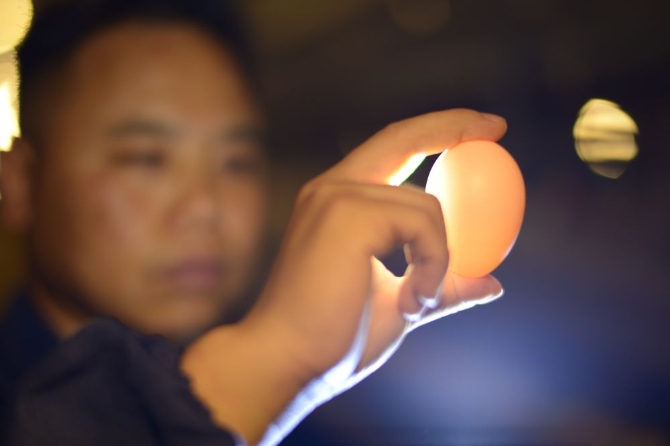 ↑6月15日,在玉屏縣麻音塘街道辦事處祥查村蛋雞養(yǎng)殖場(chǎng),洪余在查看雞蛋品質(zhì)。新華社記者 楊楹 攝
