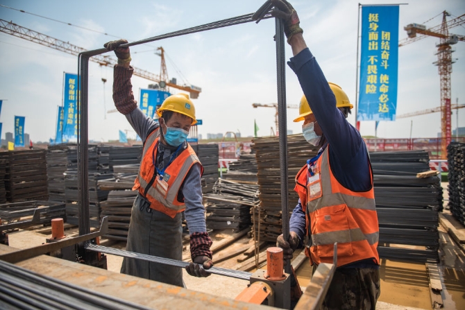 4月28日,中建三局的建設(shè)者在湖北武漢光谷大悅城建設(shè)工地作業(yè)。(新華社記者肖藝九攝)