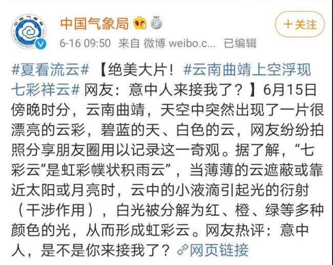 據(jù)中國(guó)氣象局官方微博@中國(guó)氣象局 發(fā)布的消息,據(jù)了解,這個(gè)“七彩云”是虹彩幞狀積雨云” ,當(dāng)薄薄的云遮蔽或靠近太陽或月亮?xí)r,云中的小液滴引起光的衍射(干涉作用),白光被分解為紅、橙、綠等多種顏色的光,從而形成虹彩云。(昆明信息港綜合)
