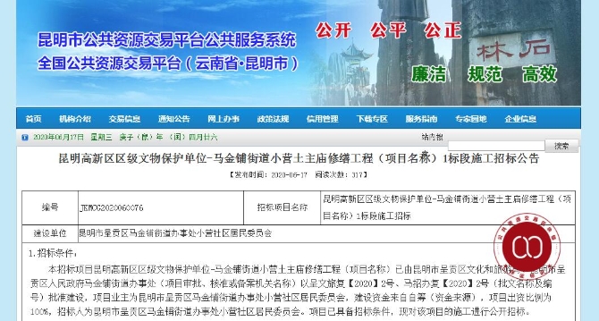 6月17日,昆明市公共資源交易平臺(tái)于發(fā)布《昆明高新區(qū)區(qū)級(jí)文物保護(hù)單位-馬金鋪街道小營(yíng)土主廟修繕工程(項(xiàng)目名稱)1標(biāo)段施工招標(biāo)公告》。