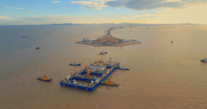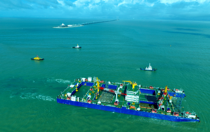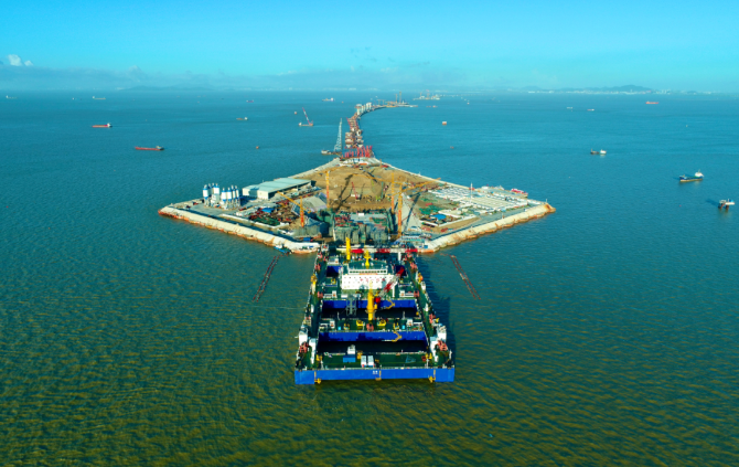 圖為裝載著首節(jié)沉管的“一航津安1”正向西人工島浮運(yùn)