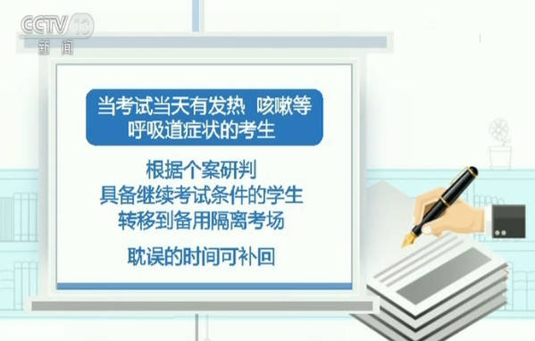 當(dāng)考試當(dāng)天有發(fā)熱、咳嗽等呼吸道癥狀的考生,根據(jù)個(gè)案研判,具備繼續(xù)考試條件的學(xué)生轉(zhuǎn)移到備用隔離考場(chǎng),耽誤的時(shí)間可補(bǔ)回。