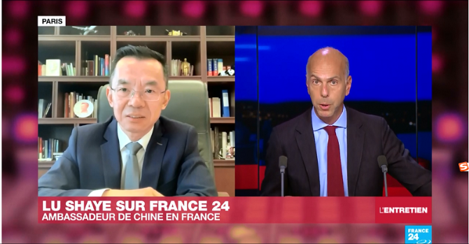 當(dāng)?shù)貢r(shí)間6月19日,中國駐法國大使盧沙野接受了法蘭西24電視臺(tái)法語頻道《訪談》欄目的專訪。