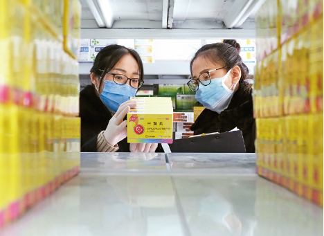 在新冠肺炎疫情防控過程中,山東省各地加大對口罩、消毒水、抗病毒類藥品等醫(yī)藥用品的市場監(jiān)管,嚴(yán)厲打擊疫情期間哄抬物價(jià)、制假售假等違法行為。圖為2020年2月6日,山東無棣縣市場監(jiān)督管理局執(zhí)法人員在一家連鎖藥店對藥品進(jìn)行監(jiān)督抽檢。新華社發(fā) 陳子慶/攝