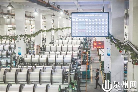 位于晉江五里工業(yè)區(qū)的信泰集團(tuán)經(jīng)編車間內(nèi),機(jī)器快速運轉(zhuǎn)。機(jī)器上方懸掛的終端顯示屏上,清晰顯示著“機(jī)臺日產(chǎn)量品質(zhì)明細(xì)表”。