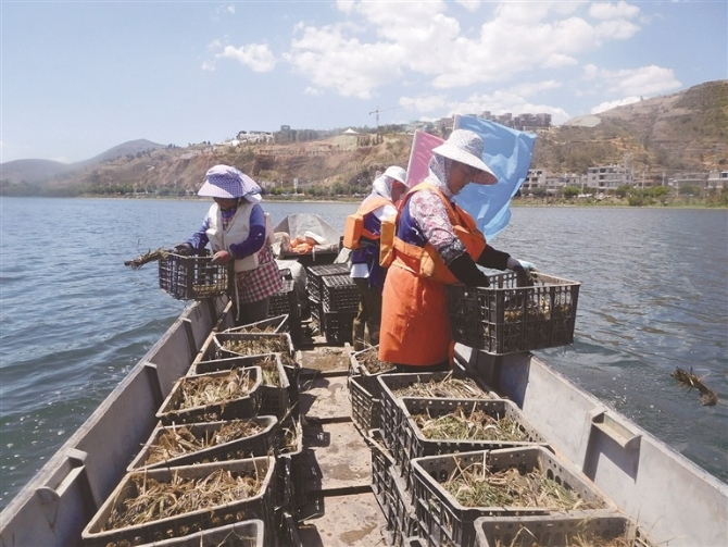 2018年5月,大理市海東鎮(zhèn)群眾在洱海向陽灣水生植物強(qiáng)化恢復(fù)區(qū)播種苦草幼苗叢。(圖片由中國科學(xué)院水生生物研究所提供)