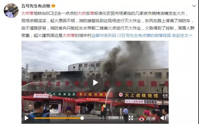 據(jù)微博網(wǎng)友@五號先生有點懶 的博文描述:起火地點在大樹營地鐵站B口過去一點點的大樹后營標準化農(nóng)貿(mào)市場,緊臨的幾家夜市燒烤店鋪發(fā)生火災(zāi)?,F(xiàn)場濃煙滾滾,起火原因不明。消防接警后已到達現(xiàn)場進行滅火作業(yè),東風(fēng)東路上停滿了消防車,由于道路狹窄,消防官兵只能拉長水帶朝二樓著火點進行滅火作業(yè),起火建筑周邊是大樹營的城中村。