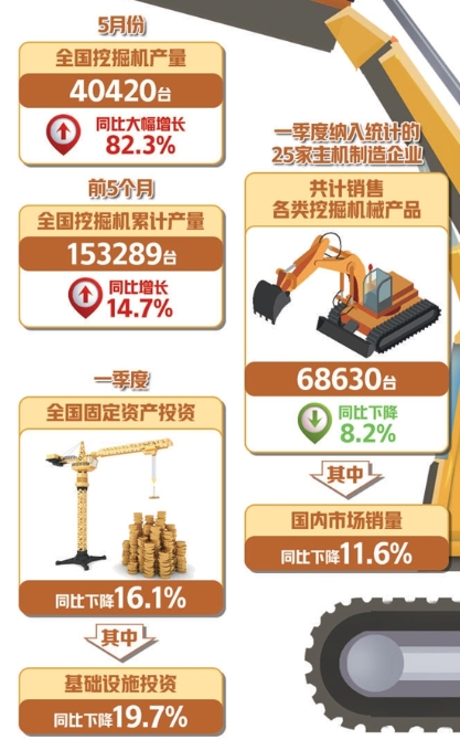 國(guó)家統(tǒng)計(jì)局公布的數(shù)據(jù)顯示,5月份,全國(guó)挖掘機(jī)產(chǎn)量40420臺(tái),同比大幅增長(zhǎng)82.3%;前5個(gè)月,全國(guó)挖掘機(jī)累計(jì)產(chǎn)量153289臺(tái),同比增長(zhǎng)14.7%。