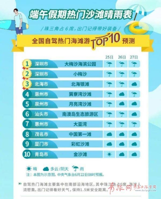 青島日報/青島觀/青報網訊 6月22日,高德地圖、中國氣象局中國天氣網聯(lián)合全國60多家公安交通管理部門共同發(fā)布《2020端午假期出行預測報告》。本次端午小長假共三天,全國高速公路不免費?!秷蟾妗奉A計,端午期間全國自駕熱門海灘游TOP10主要集中在南部沿海地區(qū),其中珠三角占6席。熱門海灘游中的深圳-大梅沙海濱公園、小梅沙以及北海-北海銀灘,成為全國自駕熱門海灘景區(qū)三甲。青島金沙灘景區(qū)列榜單第10位。