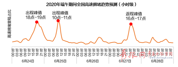 報告預測,從全國范圍來看,受節(jié)前通勤晚高峰及提前出行的影響,預計2020年6月24日(端午前一天)全國高速擁堵程度較高,返程6月27日高速擁堵程度較高。