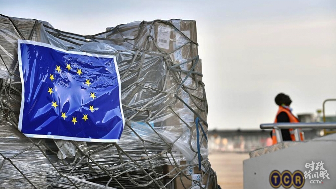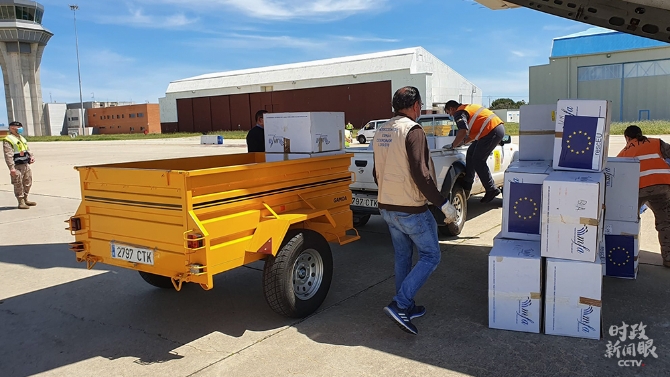△歐盟為成員國運(yùn)送醫(yī)療物資和設(shè)備。(總臺(tái)央視記者馬瑾瑾提供)