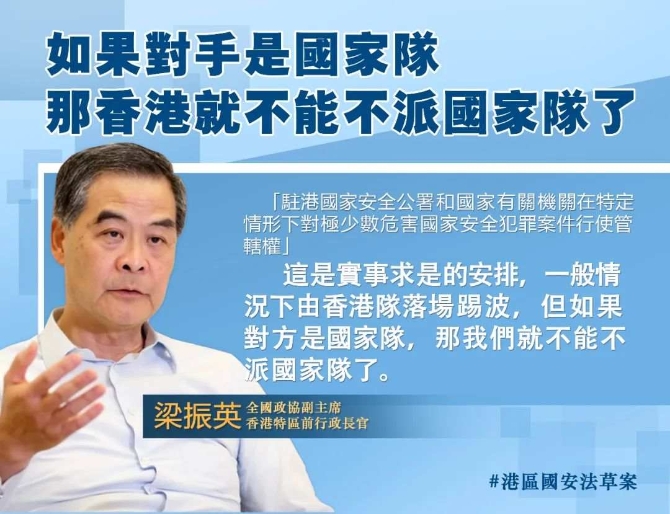 全國政協(xié)副主席梁振英日前引述《港區(qū)維護(hù)國家安全法》草案的說明稱:“駐港國家安全公署和國家有關(guān)機(jī)關(guān)在特定情形下對極少數(shù)危害國家安全犯罪案件行使管轄權(quán),是中央全面管治權(quán)的重要體現(xiàn),有利于支持和加強(qiáng)香港特別行政區(qū)維護(hù)國家安全執(zhí)法工作和司法工作,有利于避免可能出現(xiàn)或者導(dǎo)致出現(xiàn)香港特別行政區(qū)基本法第十八條第四款規(guī)定的緊急狀態(tài)情形”。