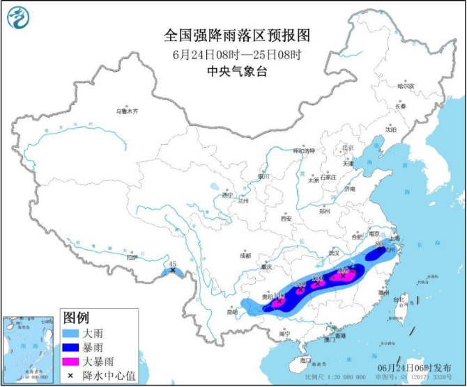 中央氣象臺(tái)6月24日06時(shí)繼續(xù)發(fā)布暴雨黃色預(yù)警:預(yù)計(jì),6月24日08時(shí)至25日08時(shí),貴州南部、廣西北部、湖南中部、江西中北部、福建西北部、安徽南部、浙江中北部等地的部分地區(qū)有大到暴雨,其中,貴州東南部、廣西北部、湖南中部、江西中部等地局地有大暴雨(100~180毫米)。上述部分地區(qū)伴有短時(shí)強(qiáng)降水(最大小時(shí)降雨量30~60毫米,局地可超過(guò)70毫米),局地有雷暴大風(fēng)等強(qiáng)對(duì)流天氣。