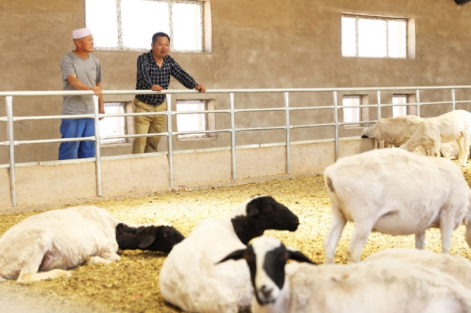 寧夏同春緣農(nóng)業(yè)科技發(fā)展有限公司董事長雷燦煌(右)正在和員工查看杜泊羊養(yǎng)殖情況