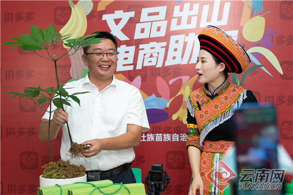 6月22日上午,在云南省文山壯族苗族自治州“文品出山”區(qū)域公共品牌發(fā)布會現(xiàn)場搭建的拼多多直播間里,文山州委副書記、州長張秀蘭化身“帶貨達人”,向鏡頭前的網友推介當?shù)刈罹咛厣霓r特產品,利用電商直播,借助“文品出山”區(qū)域公共品牌,提升文山州農特產品知名度。