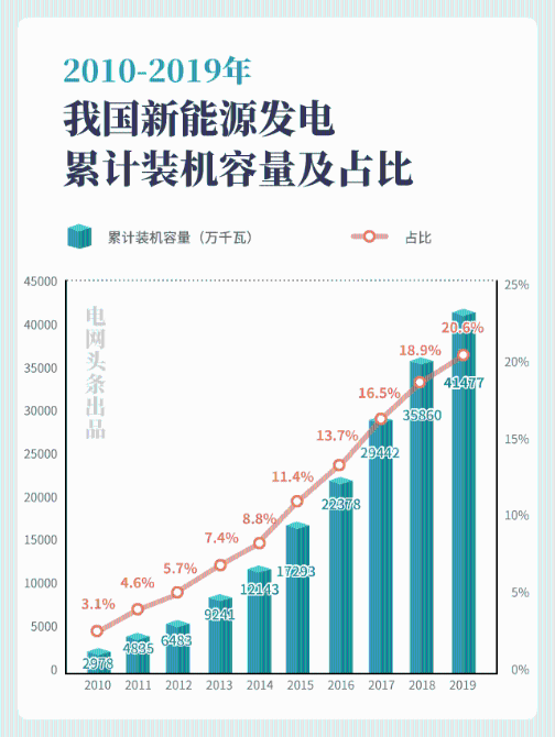 2019年年底,在國家電網經營區(qū),新能源發(fā)電累計裝機容量3.5億千瓦,同比增長16%;占電源總裝機容量的比重達到22.3%,同比提高1.9個百分點。