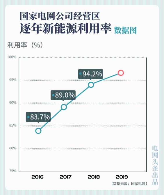 2019年,國家電網經營區(qū)新能源消納矛盾持續(xù)緩解,新能源利用水平不斷提高,利用率96.8%、同比提升2.7個百分點,提前一年實現(xiàn)新能源利用率95%以上的國家目標。