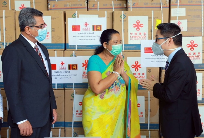 6月24日,斯里蘭卡衛(wèi)生部長萬尼亞拉奇(中)在科倫坡舉行的中國政府第三批援斯抗疫物資交接儀式上向中國駐斯里蘭卡大使館臨時代辦胡煒(右)表示感謝。(新華社發(fā),阿吉特·佩雷拉攝)