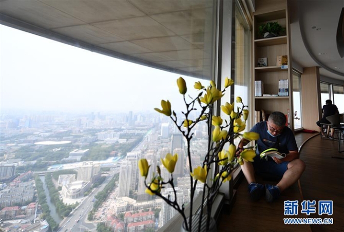 天津市河西區(qū)天津廣播電視塔內(nèi)有一個(gè)“高空書(shū)吧”,是一個(gè)既能品味書(shū)香,又能欣賞津城全景的休閑閱讀空間。 據(jù)了解,天塔西岸書(shū)齋·知道吧距離地面257米,面積約600平方米,有藏書(shū)近萬(wàn)冊(cè),涵蓋文學(xué)、歷史、兒童繪本等22個(gè)種類。自6月10日恢復(fù)開(kāi)放以來(lái),日均吸引200余人次到訪。