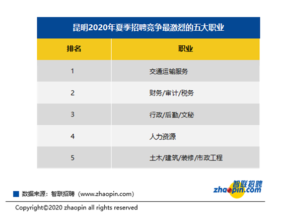 智聯(lián)招聘在線數(shù)據(jù)顯示,昆明地區(qū)2020年夏季競(jìng)爭(zhēng)最激烈的職業(yè)是交通運(yùn)輸服務(wù)、財(cái)務(wù)/審計(jì)/稅務(wù)和行政/后勤/文秘。此外,人力資源和土木/建筑/裝修/市政工程的競(jìng)爭(zhēng)也較為激烈。