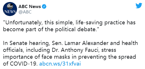 鑒于一些州近來(lái)確診病例顯著增加,包括參議院多數(shù)黨領(lǐng)袖米奇·麥康奈爾在內(nèi)的國(guó)會(huì)共和黨人都開(kāi)始呼吁戴口罩,與之前立場(chǎng)大不相同。主持聽(tīng)證會(huì)的田納西州共和黨參議員拉馬爾·亞歷山大援引美國(guó)疾病控制和預(yù)防中心的研究表示,戴口罩會(huì)顯著減緩病毒的傳播。