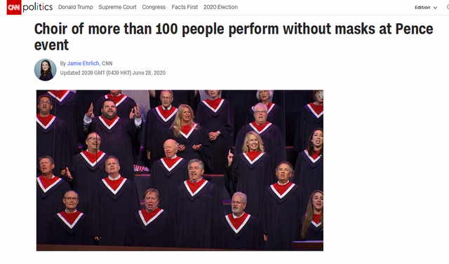 CNN報(bào)道稱,當(dāng)被問(wèn)到是否愿意在公共場(chǎng)合戴口罩時(shí),美國(guó)副總統(tǒng)彭斯日前表示,他會(huì)跟總統(tǒng)一樣,在公共場(chǎng)合戴上口罩的。然而,就在幾小時(shí)之前,彭斯在達(dá)拉斯的一個(gè)大型教堂發(fā)表講話,現(xiàn)場(chǎng)有2000多名參會(huì)者和100人的唱詩(shī)班。唱詩(shī)班人員站得很近,唱歌時(shí)沒(méi)人戴口罩。