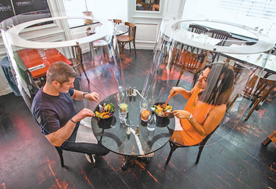 法國設(shè)計(jì)師研發(fā)了一款易于安裝、清潔和消毒的保護(hù)罩,旨在保護(hù)人們疫情期間在餐館、酒吧、酒店等公共場所用餐時的安全。圖為近日,在法國巴黎一家餐館,客人在保護(hù)罩內(nèi)用餐。新華社發(fā)