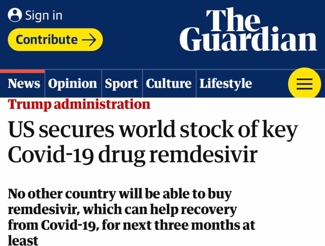 英國(guó)《衛(wèi)報(bào)》6月30日?qǐng)?bào)道,美國(guó)政府已經(jīng)下單購(gòu)買了超過(guò)50萬(wàn)劑瑞德西韋,這意味著吉利德公司整個(gè)7月的產(chǎn)能以及8月、9月產(chǎn)能的90%都被美國(guó)“買斷”了。