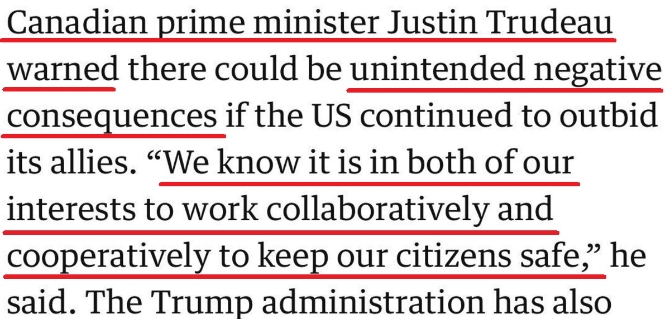 對(duì)于美國(guó)的霸道“買斷”行為,就連盟友都看不下去了,紛紛站出來(lái)公開指責(zé)美國(guó)的行為。加拿大總理特魯多警告稱,美國(guó)如果堅(jiān)持通過(guò)惡意競(jìng)價(jià)的方式打擊其盟友,可能會(huì)招致意想不到的惡果,“我們知道,只有合作才符合我們雙方的利益,并能夠保障兩國(guó)國(guó)民的安全?!?/p>
