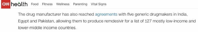 而這位學(xué)者所言似乎正在成為“現(xiàn)實(shí)”。CNN報(bào)道稱,瑞德西韋生產(chǎn)商與印度、埃及和巴基斯坦的五家仿制藥生產(chǎn)商達(dá)成了協(xié)議,使他們能夠在127個(gè)主要為低收入和中低收入國(guó)家的清單中生產(chǎn)瑞德西韋。