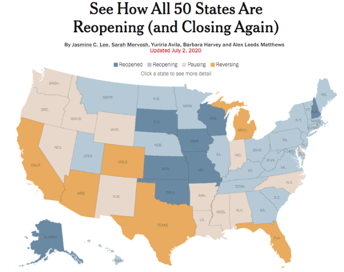 △《紐約時(shí)報(bào)》相關(guān)數(shù)據(jù)顯示,已有6個(gè)州因?yàn)橐咔閻夯匦禄謴?fù)“封閉”。