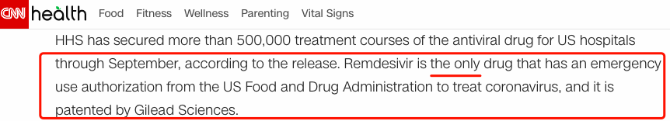 △CNN報(bào)道稱,瑞德西韋是唯一獲得緊急使用授權(quán)治療新冠病毒的藥物