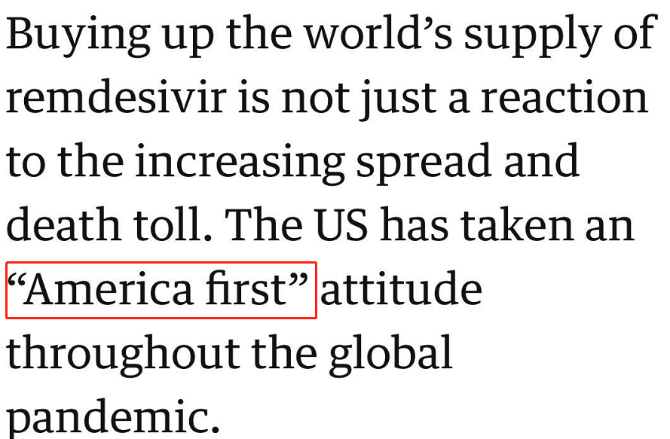 特朗普繼任以來(lái),一直奉行著“美國(guó)優(yōu)先”信條,而這次的“霸道囤貨”也是基于此。英國(guó)《衛(wèi)報(bào)》的報(bào)道就明確提到,美國(guó)急于囤貨不僅是因?yàn)橐咔?也是美國(guó)在應(yīng)對(duì)全球疫情中采取“美國(guó)優(yōu)先”信條的體現(xiàn)。
