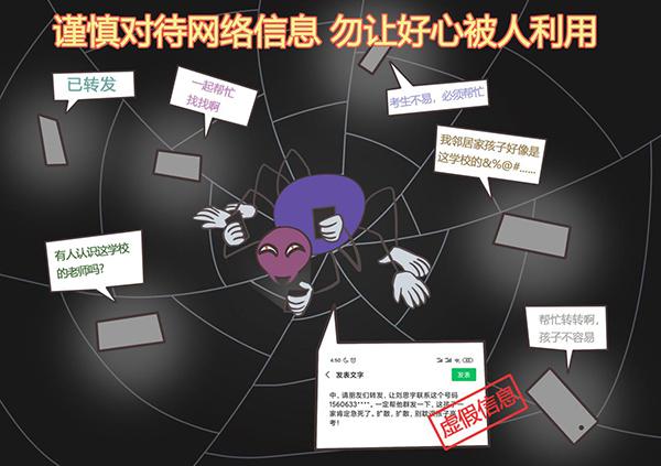 【案例1】2019年高考開考前夕,微信群、朋友圈等網(wǎng)絡(luò)平臺流傳著一則虛假信息,聲稱“撿到一張高考準(zhǔn)考證,劉思宇,考點在實驗高中,請朋友們轉(zhuǎn)發(fā),讓劉思宇聯(lián)系這個號碼1560633****。一定幫他群發(fā)一下,這孩子一家肯定急死了。擴散,擴散,別耽誤孩子高考!”從2016年“白婭倩”、2017的“楊雷雷”“孫超”“黨喜龍”、2018年“劉明煒”“劉明婷”等同學(xué)到2019年的“劉思宇”,年年丟失準(zhǔn)考證,內(nèi)容如出一轍,套路依舊。