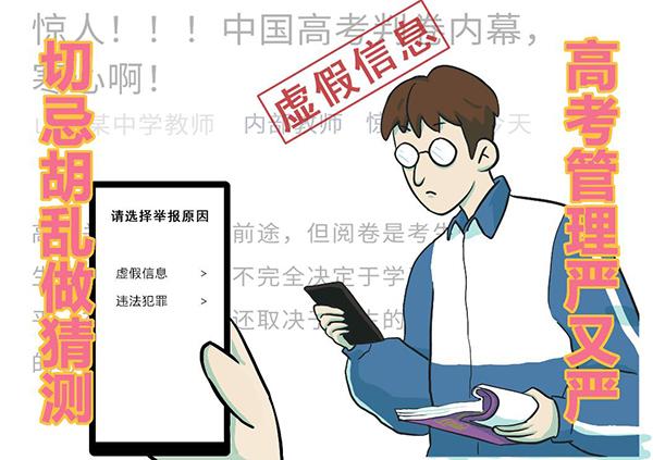 【案例】2019年高考前,一篇題為《驚人?。。≈袊呖寂芯韮?nèi)幕,寒心啊!》的文章在網(wǎng)上熱傳。該文作者自稱是“山西某中學(xué)教師”,參與過高考閱卷。在閱卷過程中發(fā)現(xiàn),有一些閱卷老師為了趕進(jìn)度,不管對錯隨意批改,而且復(fù)核者也未發(fā)現(xiàn)問題,甚至出現(xiàn)了“20分題被給0分”的極端情況。文章最后得出結(jié)論:“高考關(guān)系著考生的前途,但閱卷是考生的關(guān)口。考生能否順利過關(guān),不完全決定于學(xué)習(xí)成績和答題水平,在很大程度上還取決于考生的運氣,閱卷老師的心情。”此文涉及高考內(nèi)容,吸引眼球,在網(wǎng)上流傳至少已經(jīng)超過10年,內(nèi)容嚴(yán)重失實。由于內(nèi)容過于“驚世駭俗”,每年高考之后總會被好事之徒拿出來傳播。2019年,教育部官網(wǎng)在盤點高考謠言時已對該文進(jìn)行過專門辟謠?! ?/p>