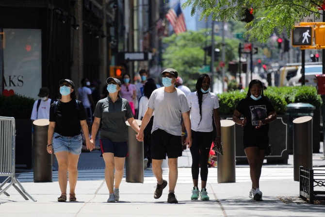 7月4日,人們戴著口罩走在美國(guó)紐約第五大道。(新華社記者王迎攝)