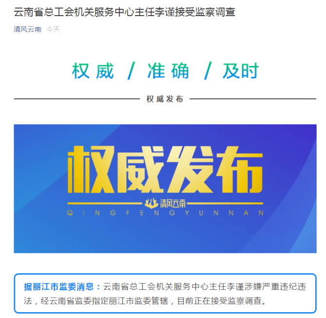 云南省總工會(huì)機(jī)關(guān)服務(wù)中心主任李謹(jǐn)涉嫌嚴(yán)重違紀(jì)違法,經(jīng)云南省監(jiān)委指定麗江市監(jiān)委管轄,目前正在接受監(jiān)察調(diào)查。