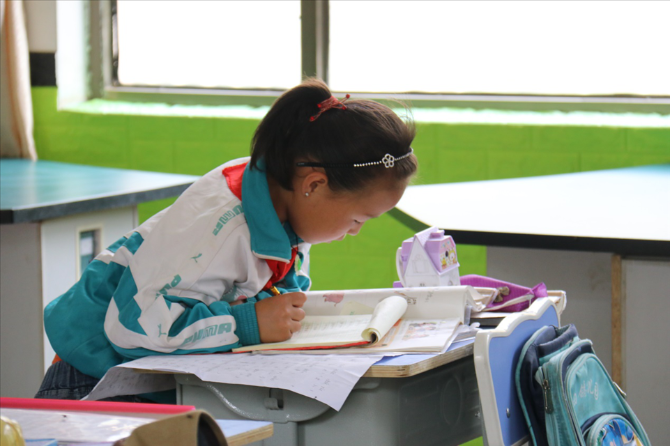 布楞溝小學(xué)一學(xué)生在課間寫作業(yè)。 黃鷹攝