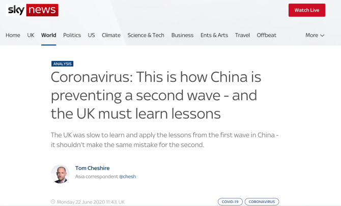 在英國天空新聞網(wǎng)站22日發(fā)表的文章《中國是這樣防止第二撥疫情的——英國必須學(xué)習(xí)經(jīng)驗(yàn)》中,記者講述了自己的親身經(jīng)歷: