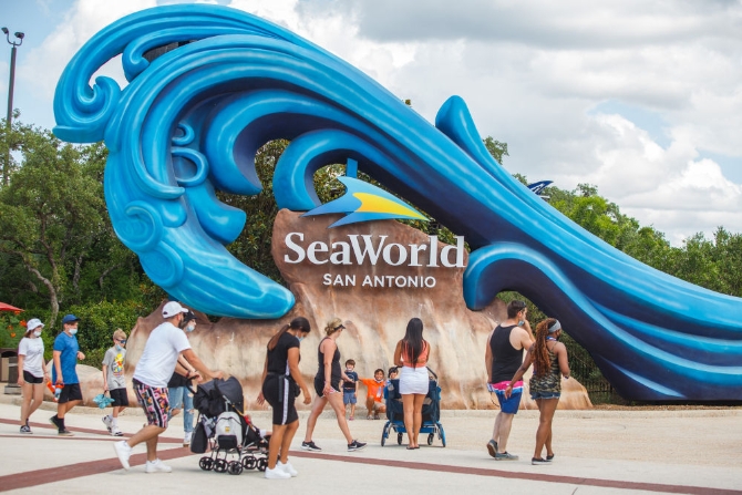 6月19日,位于美國得克薩斯州圣安東尼奧市的海洋世界主題公園重新開放。公園要求游客必須戴口罩,并保持2米的社交距離。新華社發(fā)(馬烈攝)