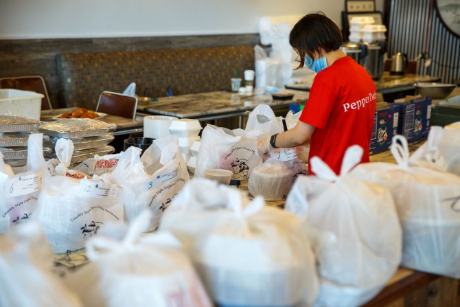 7月3日,店員在美國休斯敦的一家中餐館分裝外賣。新華社發(fā)(馬烈攝)
