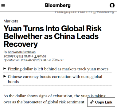 △彭博社稱,中國引領(lǐng)經(jīng)濟復(fù)蘇,人民幣成為全球風(fēng)險情緒“晴雨表”