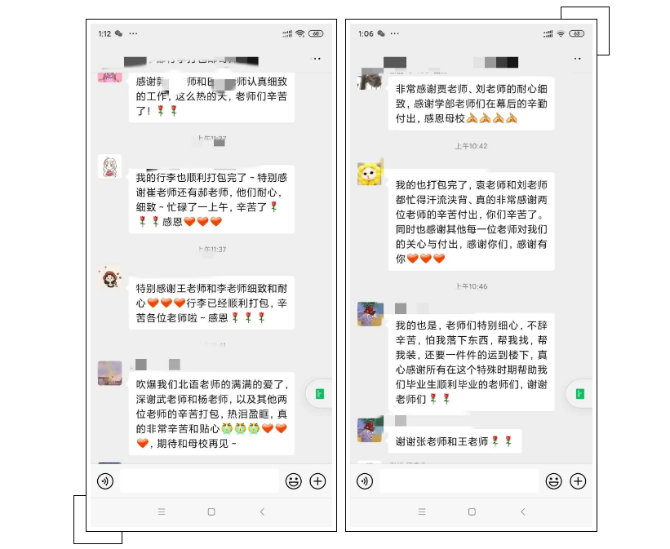 當(dāng)同學(xué)得知兩名老教授親自為自己整理時,激動地說:“真的沒想到,兩位老教授在為我收拾行裝,好想再回到母校!”有同學(xué)則在微信群留言:“吹爆我們老師滿滿的愛,期待和母校再見!”